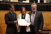 A coordenadora do Programa Bem Viver, Cynthia Orengo, com o troféu e o certificado do prêmio.