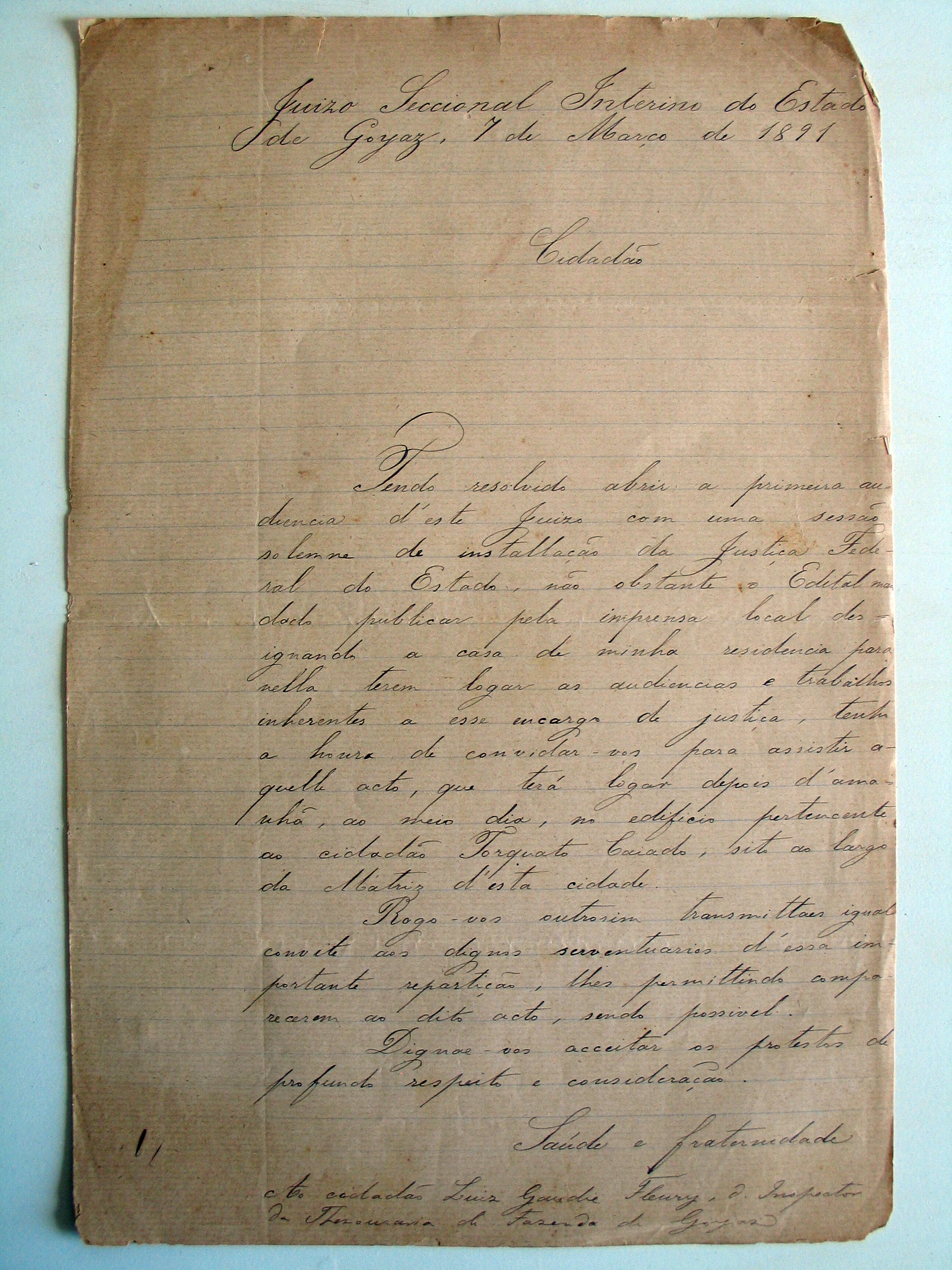 Convite para instalação da Justiça Federal/GO.[break][break]Pertence ao acervo do Museu das Bandeiras, Cidade de Goiás.[break]Foto: Ascom/MPF/GO, 2007.