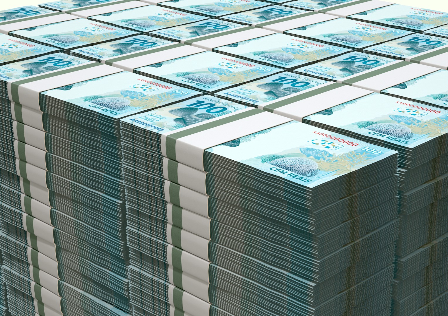 A pile of wads of brazilian real banknotes on an isolated background