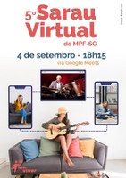 O Programa Bem Viver do Ministério Público Federal (MPF) em Santa Catarina promove nesta sexta-feira (4), a partir das 18h15, o 5º Sarau Virtual, um encontro festivo de colegas de trabalho com apresentações musicais e poéticas. Mais uma vez o Sarau terá a participação dos artistas prata da casa, do MPF em SC, e também de colegas de outros estados.